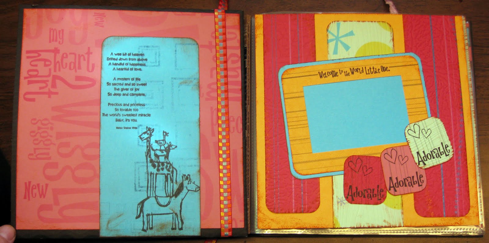 Ok - another baby gift for another friend of the family. This is a quick little 8x8 album. I was rummaging through my stuff and found a baby kit from ClubScrap that I bought a few years ago - the Oh Baby kit, if I recall correctly. I made the album cover out of some corrugated 8.5 x 11 cardstock, it is white on one side, black on the other. I just inked up the front to match the papers and covered the black side up with patterned papers. I just punched holes into the corrugated paper to match the page protectors and tied ribbons through the whole batch of them to create the binding. The kit had a bunch of cut-outs with sayings and sentiments.
